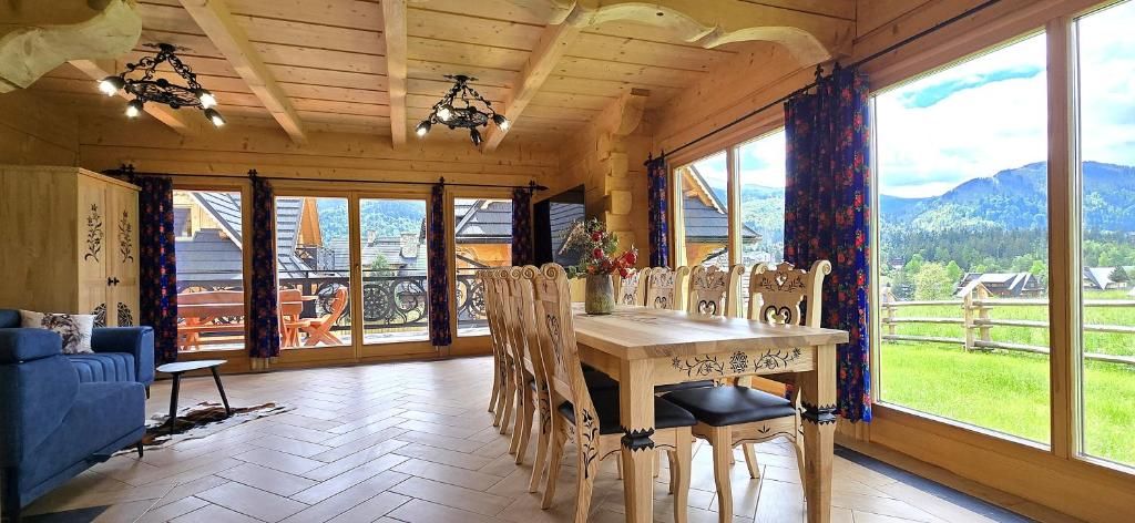 Z salonu oraz tarasu rozciąga się widok na góry, który zachwyca zarówno o poranku przy filiżance kawy, jak i wieczorem przy zachodzie słońca.